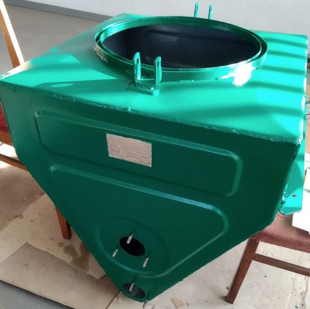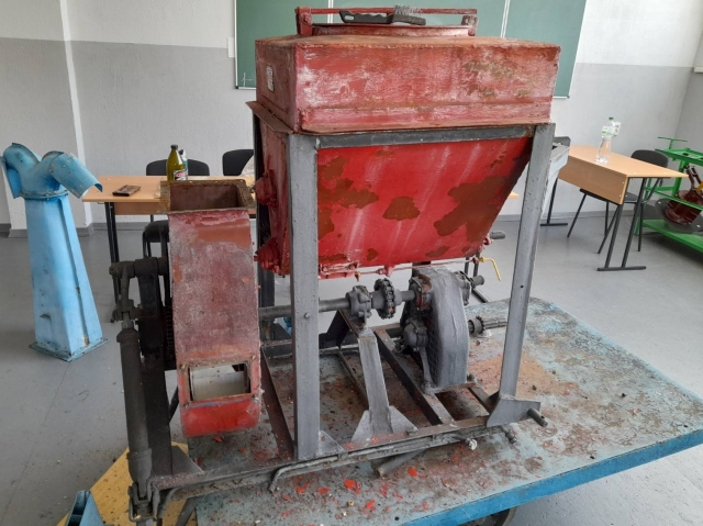 При цьому уся машина була повністю очищена від залишків фарби та іржі до чистої металевої поверхні, відрихтовано і вирівняно вм’ятини та погнутості, максимально поновлена комплектність машини, здійснене пофарбування машини з наданням складовим частинам різних кольорів для методично кращого подання студентам при вивченні, саму машину встановлено на роликові опори для полегшення її переміщення. Кафедра, таким чином, отримала відновлений практично до нового стану обпилювач ОШУ-50!