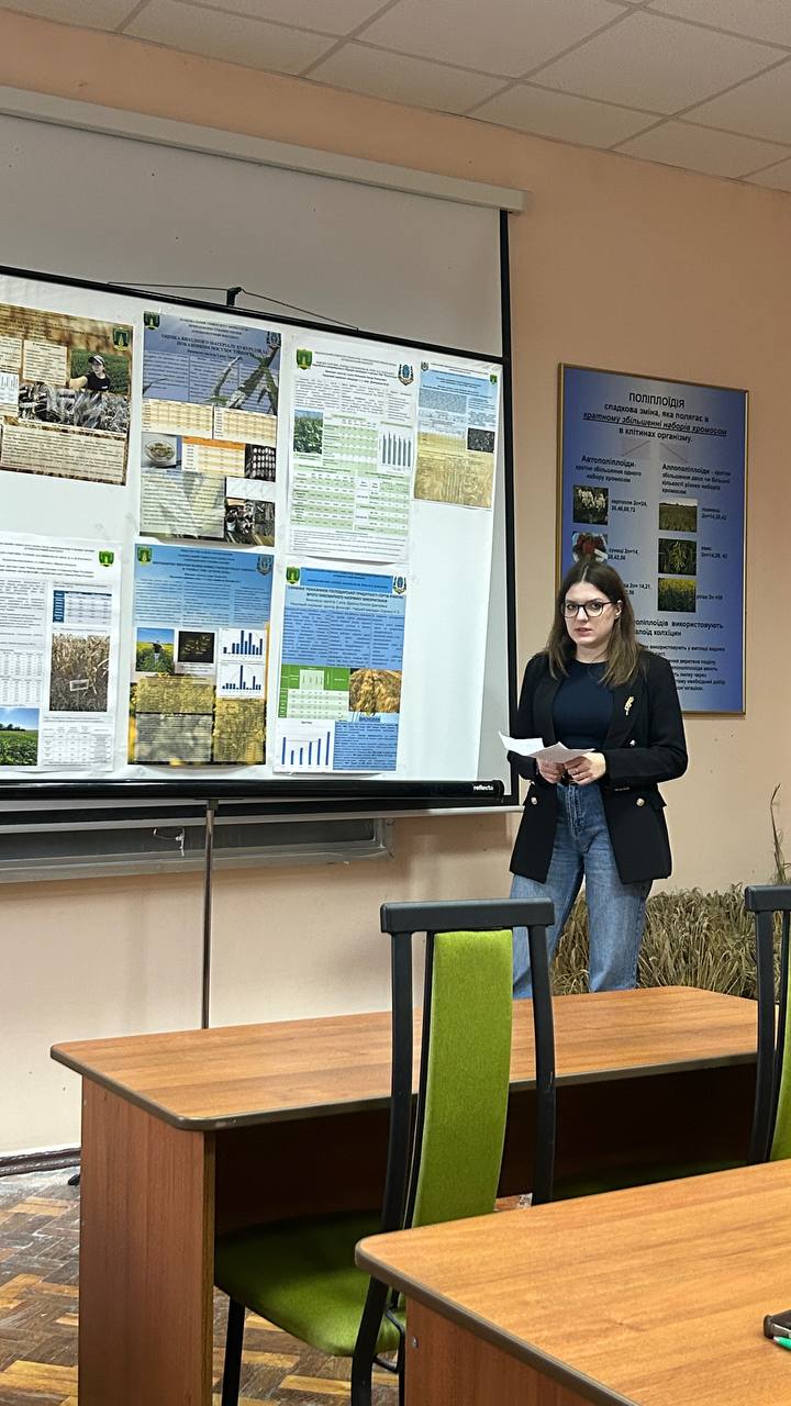 Наталія Дудкіна – «Оцінка сортів ячменю ярого за показниками придатності до поширення в Україні». Представила результати порівняння сортів за урожайністю, стабільністю та можливістю їх вирощування у різних кліматичних умовах.