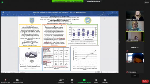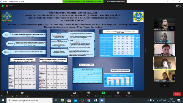 23 листопада в он-лайн режимі відбулася постерна презентація випускних робіт студентів магістратури 2-го року навчання спеціальності 051 «Економіка», (спеціалізації «Економіка підприємства»), вибіркового блоку «Економіка аграрних формувань».