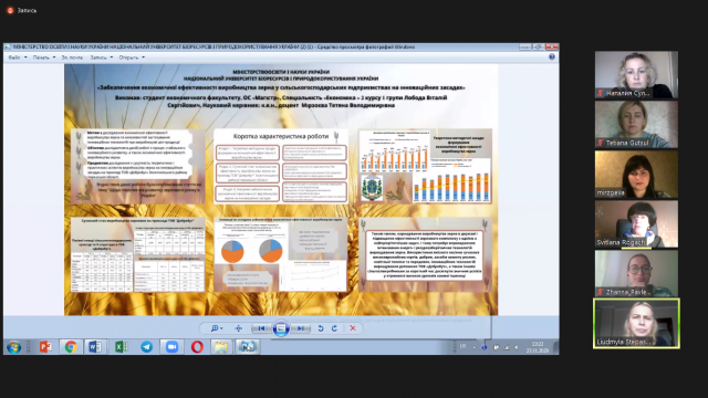 23 листопада в он-лайн режимі відбулася постерна презентація випускних робіт студентів магістратури 2-го року навчання спеціальності 051 «Економіка», (спеціалізації «Економіка підприємства»), вибіркового блоку «Економіка аграрних формувань».