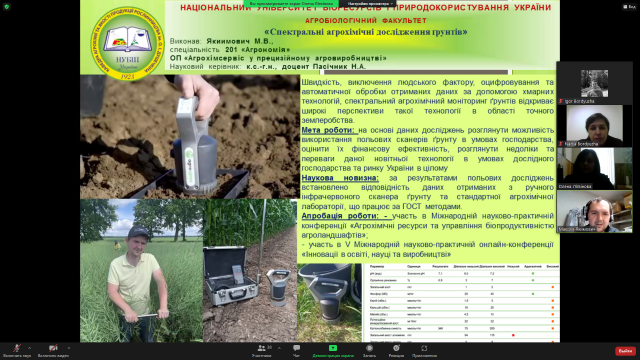 Сьогодні свої наукові здобутки представили магістри кафедри агрохімії та якості продукції рослинництва ім. О.І.Душечкіна, що навчаються за освітніми програмами «Агрохімсервіс у прецизійному агровиробництві» і «Агрохімія та ґрунтознавство», на портерній конференції, що відбулась у межах роботи Міжнародної науково-практичної конференції «Агрохімічні ресурси та управління біопродуктивністю агроландшафтів».