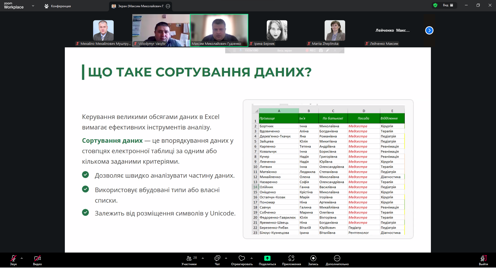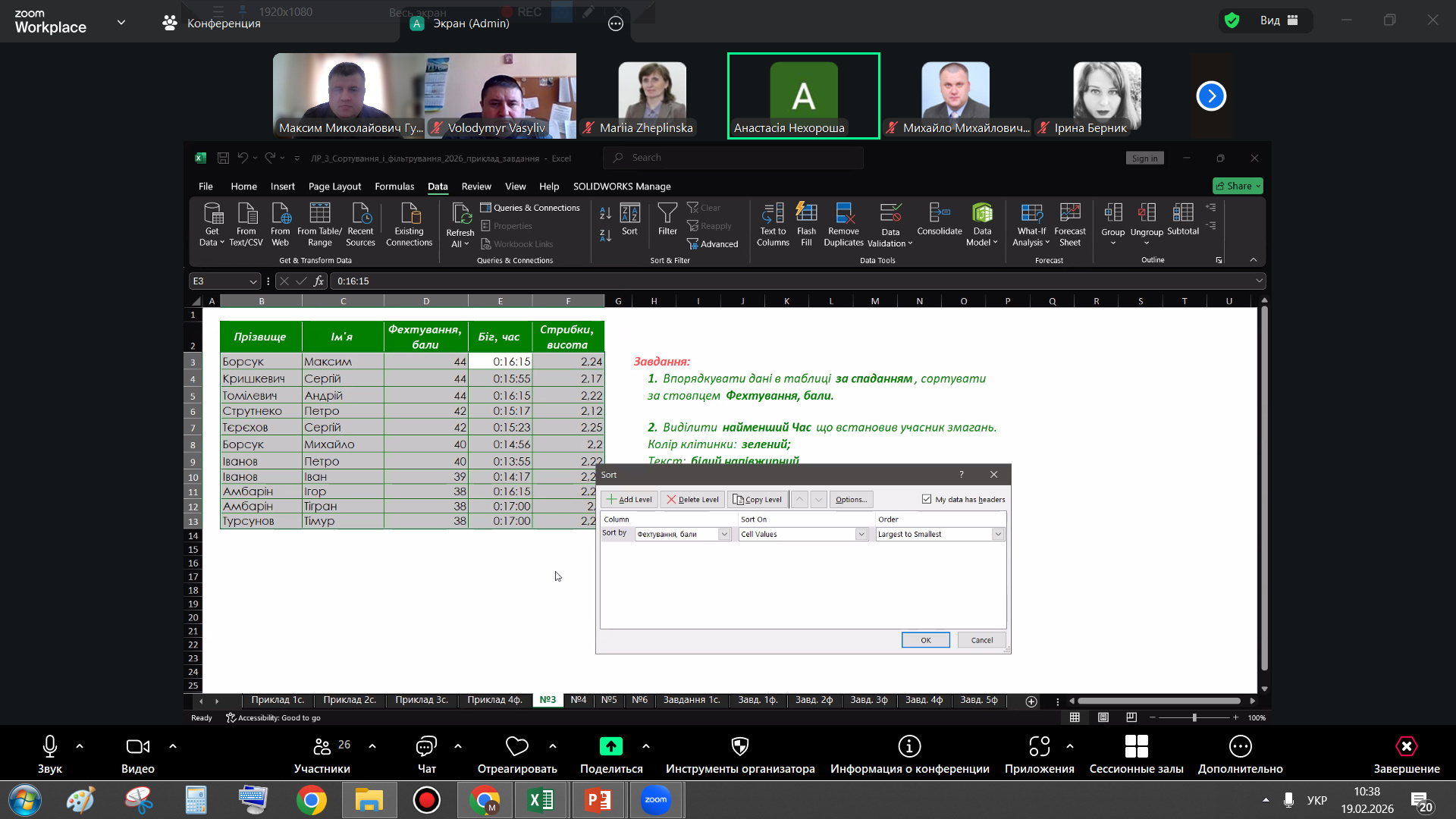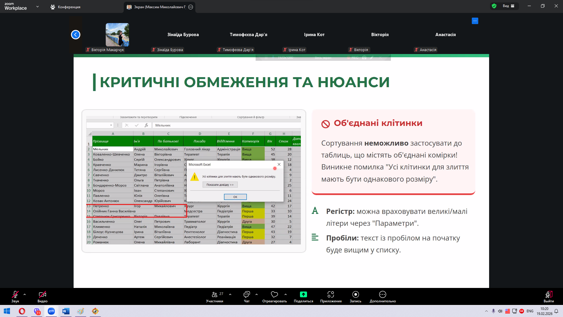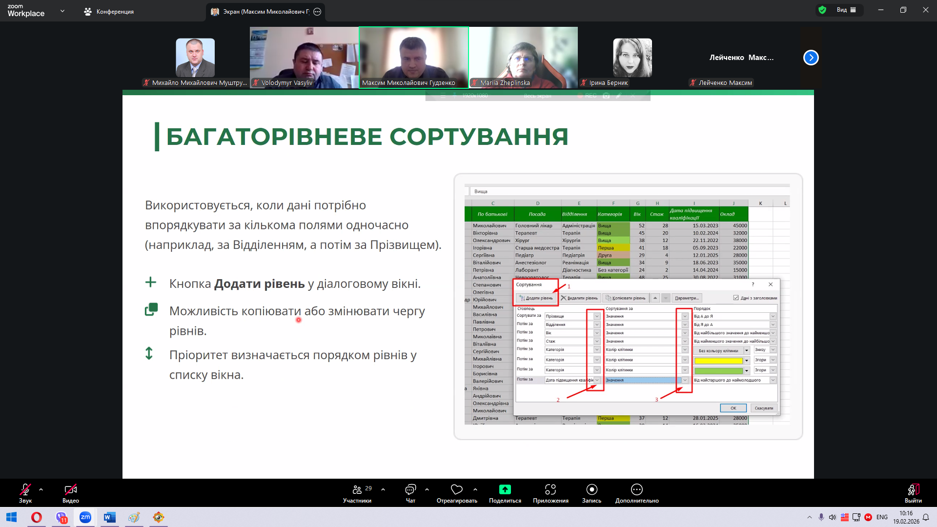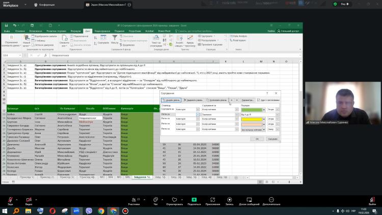 У першому блоці розглядалися алгоритми сортування даних як основа подальшого аналітичного опрацювання інформації. Лектор акцентував увагу на пріоритетності типів даних — від числових значень до текстових і Unicode-символів, показав створення багаторівневих списків та окреслив типові помилки, що виникають під час роботи з об’єднаними клітинками. Такий підхід дозволив студентам усвідомити логіку структурованого впорядкування інформації та його значення для коректності аналізу.