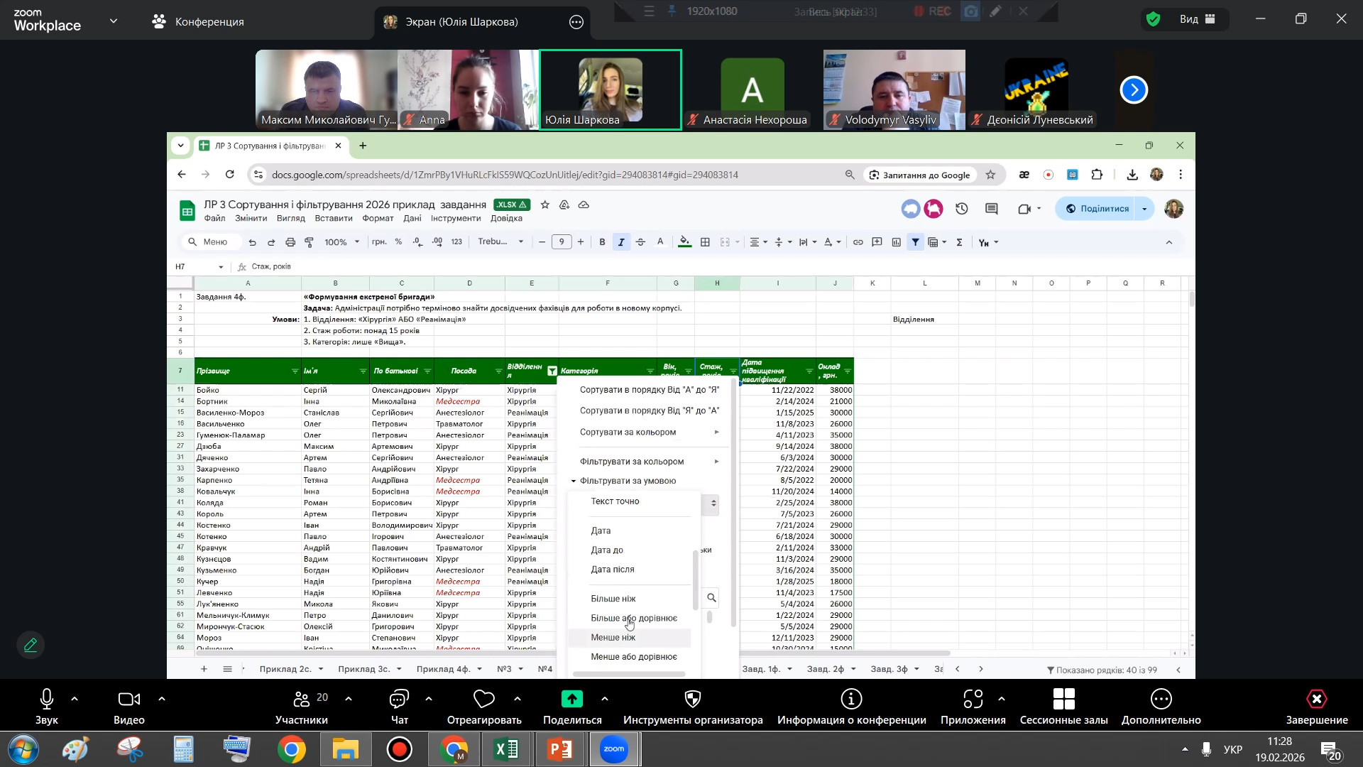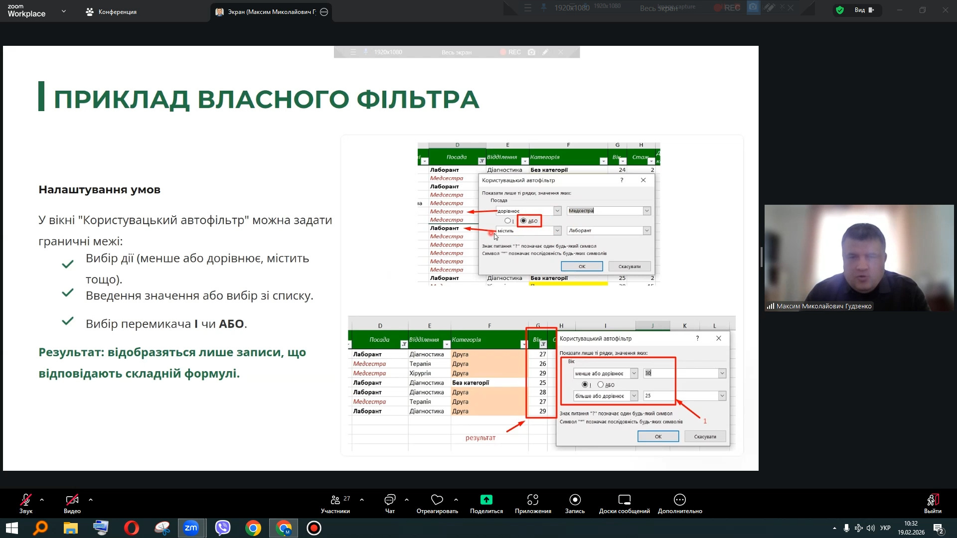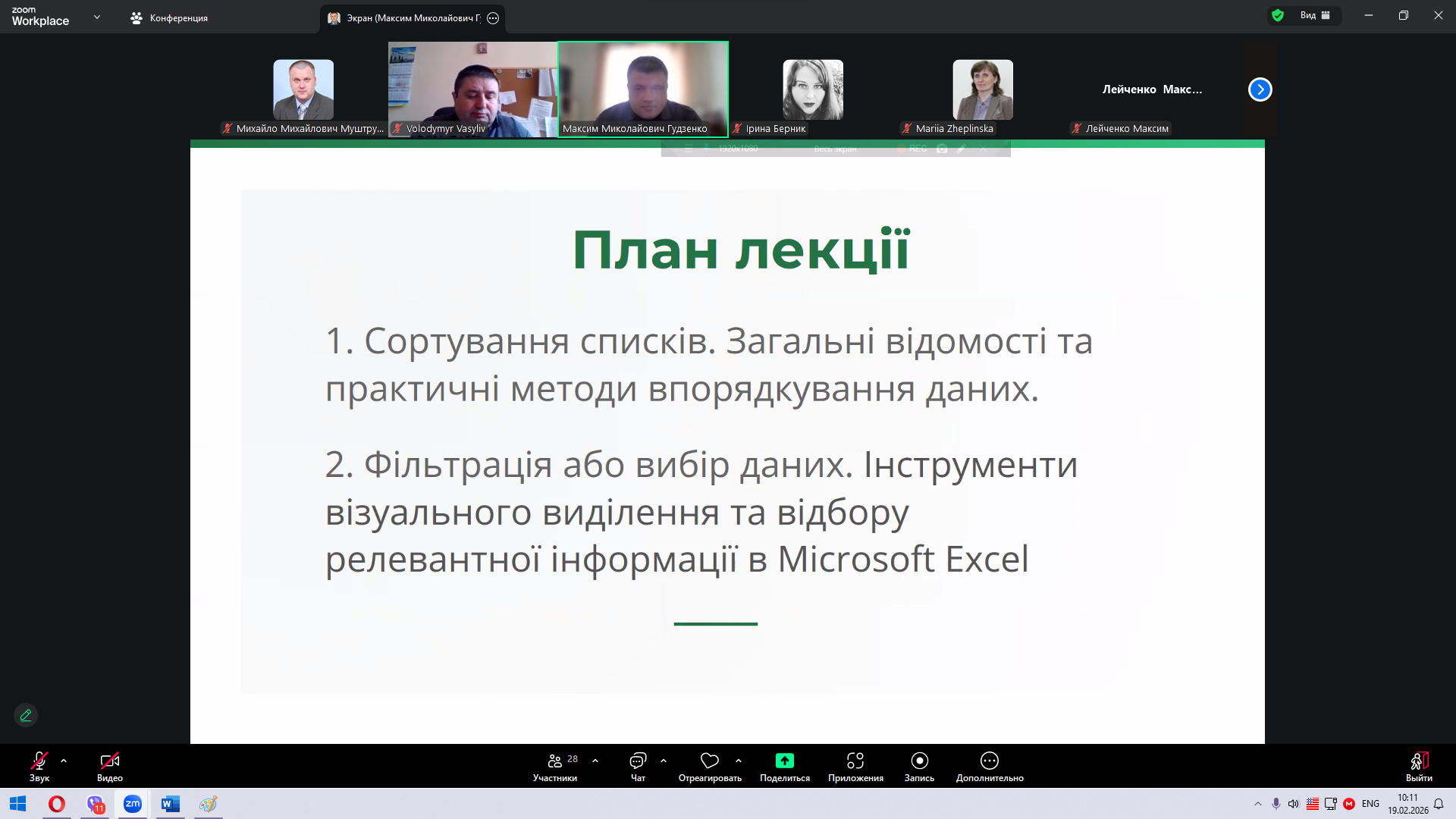 Другу частину лекції було присвячено інструментам фільтрації даних. Особливий інтерес аудиторії викликали можливості застосування текстових і числових фільтрів, використання логічних операторів «І» та «АБО», а також практичні приклади пошуку специфічних позицій у великих базах даних за допомогою символів підстановки. Це продемонструвало студентам, як ефективно працювати з великими інформаційними масивами та швидко знаходити необхідні дані для подальшого аналізу.
