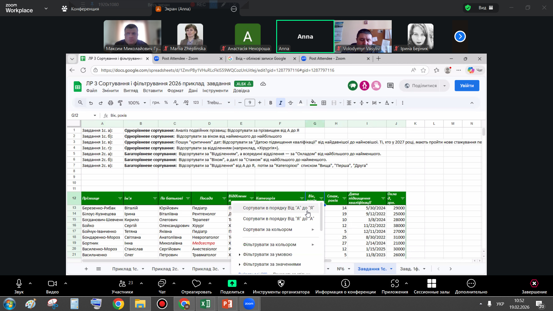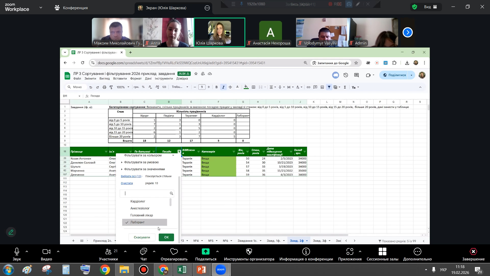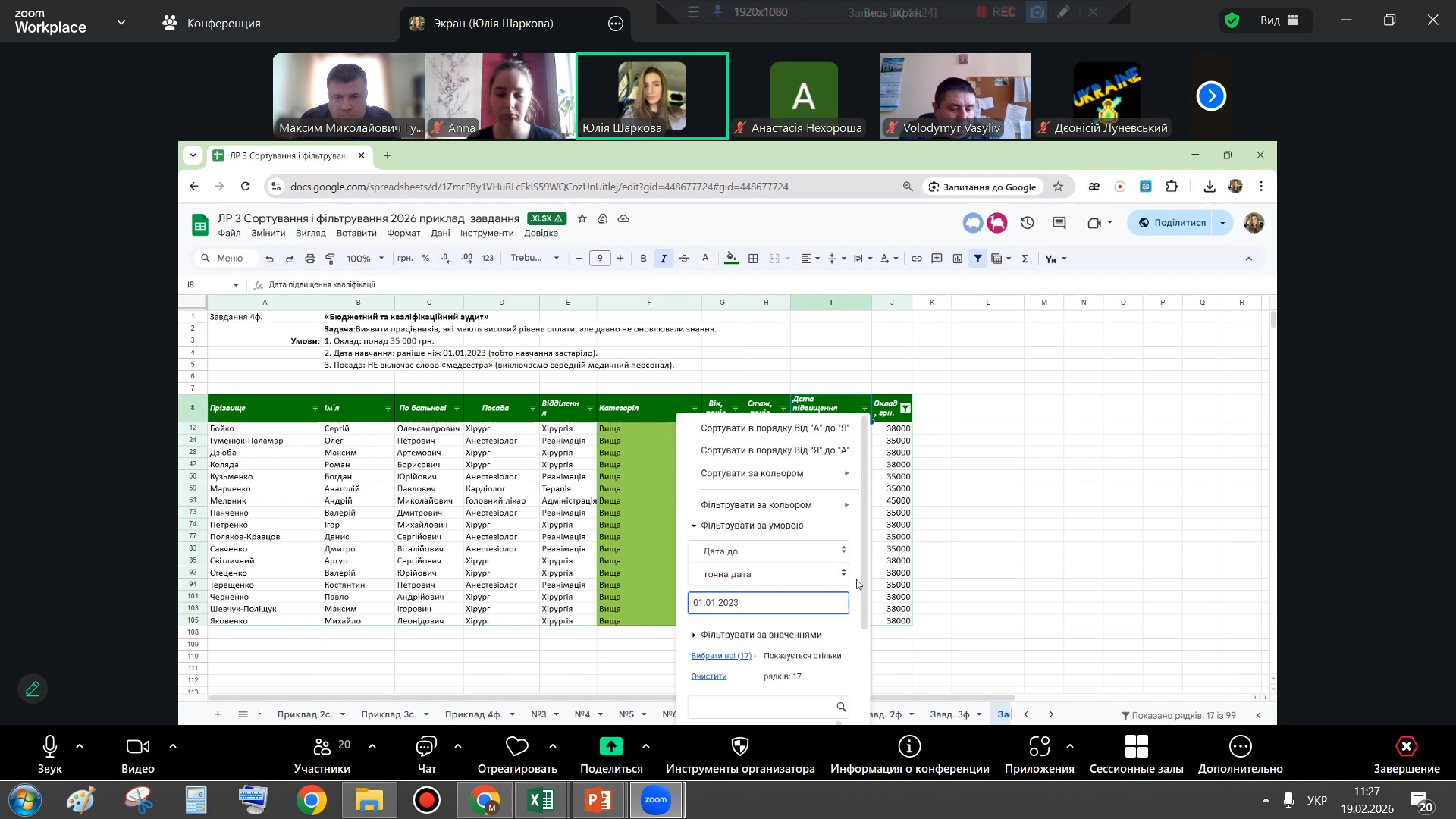 Другу частину лекції було присвячено інструментам фільтрації даних. Особливий інтерес аудиторії викликали можливості застосування текстових і числових фільтрів, використання логічних операторів «І» та «АБО», а також практичні приклади пошуку специфічних позицій у великих базах даних за допомогою символів підстановки. Це продемонструвало студентам, як ефективно працювати з великими інформаційними масивами та швидко знаходити необхідні дані для подальшого аналізу.