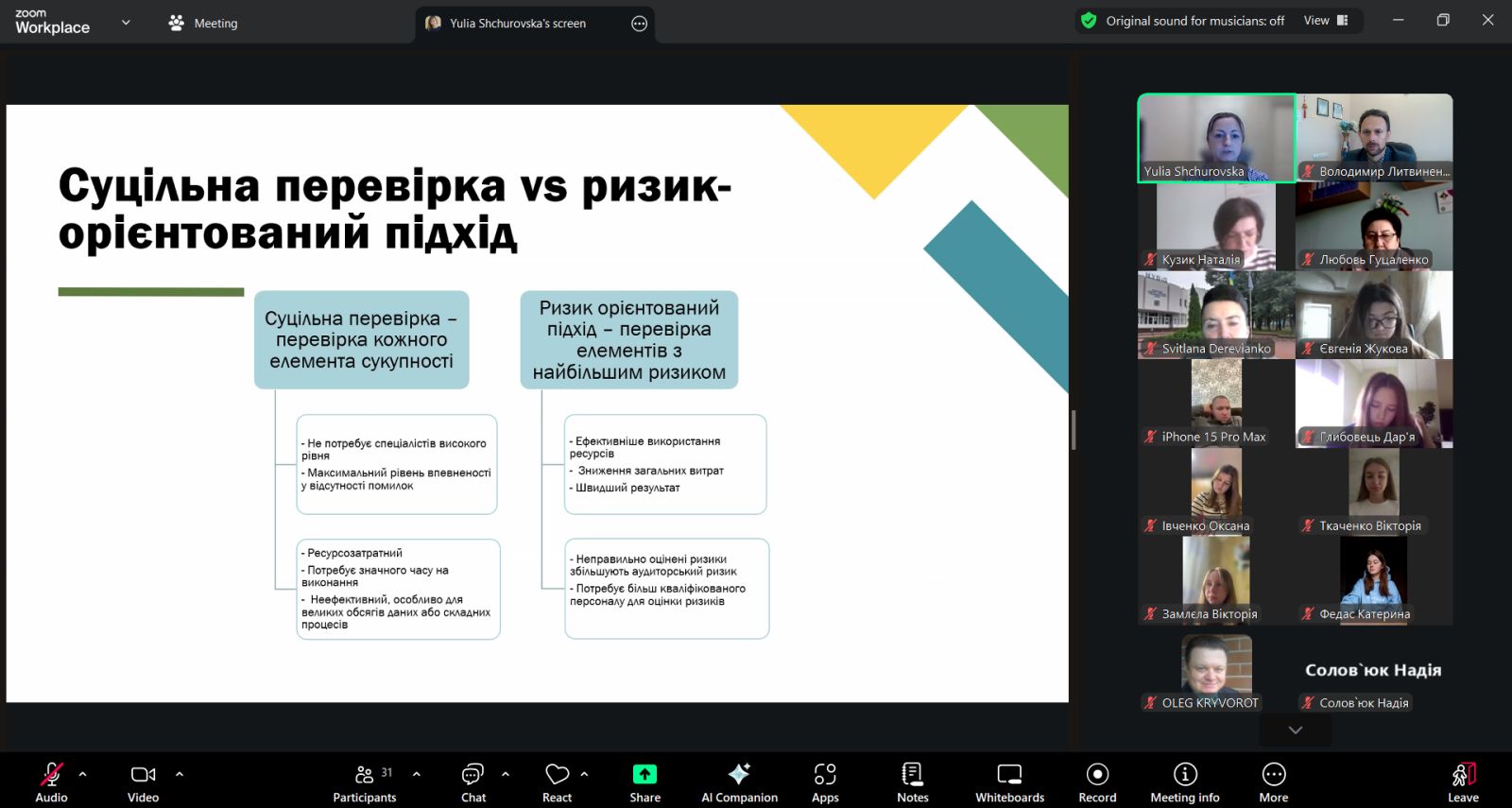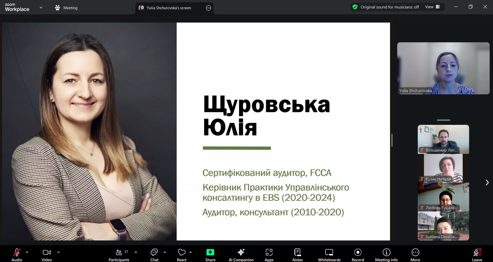 У межах реалізації практикоорієнтованого навчання на кафедрі обліку та оподаткування економічного факультету НУБіП України відбулася гостьова онлайн-лекція на тему «Практичні аспекти оцінки аудиторського ризику і визначення суттєвості». Лекцію провела сертифікований аудитор, член ACCA, керівниця практики управлінського консалтингу компанії EBS Юлія ЩУРОВСЬКА.