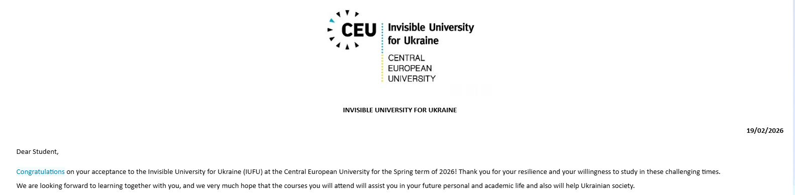Провідний фахівець музею історії НУБіП України Євгенія ШЕВЦОВА зарахована на весняний семестр 2026 року міжнародної сертифікаційної програми «Invisible University for Ukraine» (IUFU), що об’єднує українських студентів і молодих дослідників у міждисциплінарному освітньому середовищі гуманітарних і соціальних наук. Програма передбачає онлайн-навчання англійською мовою, участь у наукових дискусіях та розвиток академічних навичок.