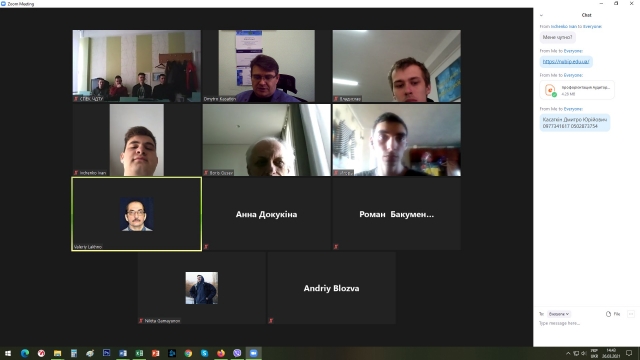 Представив факультет, кафедри та спеціальності завідувач кафедри професор Валерій Лахно, він курував онлайн бесідою та розпочав знайомство з основними перевагами спеціальності 125 – Кібербезпека.