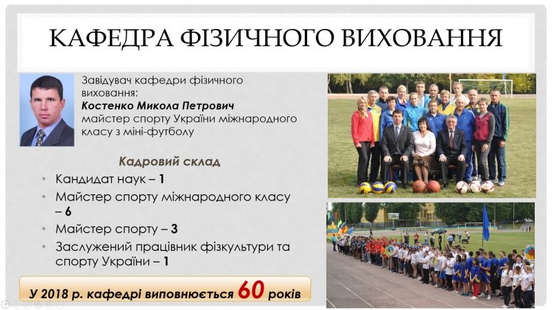 У 2016/2017 н. р. до складу факультету введено рішенням Вченої ради університету кафедру фізичного виховання. У штаті кафедри 6 (шість) майстрів спорту міжнародго класу; 3 (три) майстри спорту та Заслужений працівник фізкультури та спорту України.