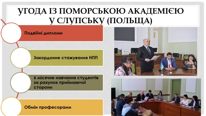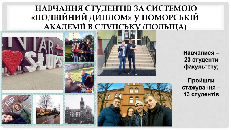 За укладеною угодою з Поморською академією в Слупську (Польща) для спеціальностей «Соціальна робота» та «Філологія», паралельно здобували освіту 23 (двадцять три) студенти факультету, проходило безкоштовне стажування – 54 , а 121 студент проходив мовну практику.