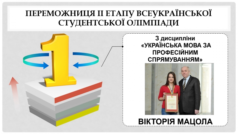 Кафедри факультету посилюють роботу з підготовки до всеукраїнських студентських олімпіад та конкурсів студентських наукових робіт. І маємо результати: першокурсниця Вікторія Мацола посіла 1 (перше) місце з української мови, (слайд 35) а третьокурсниці Ірина Ткаченко і Марина Шульга третє місце з педагогіки.