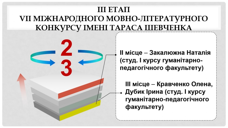 Студенти стали переможцями ІІІ етапу VІІ Міжнародного мовно-літературного конкурсу імені Тараса Шевченка: три з них посіли призові місця: першокурсниця Закалюжна Наталія виборола друге місце, Кравченко Олена і Дубик Ірина – третє.