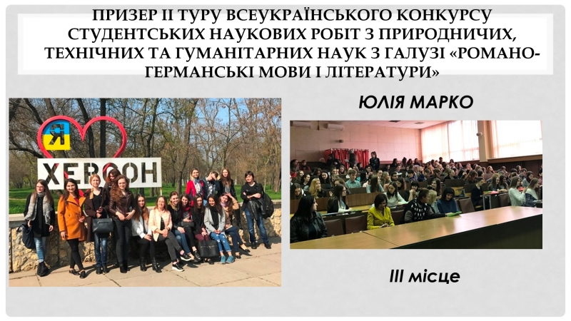 Марко Юлія стала призером Всеукраїнського конкурсу студентських наукових робіт з природничих, технічних та гуманітарних наук з галузі «Романо-германські мови і літератури», зайнявши третє місце.