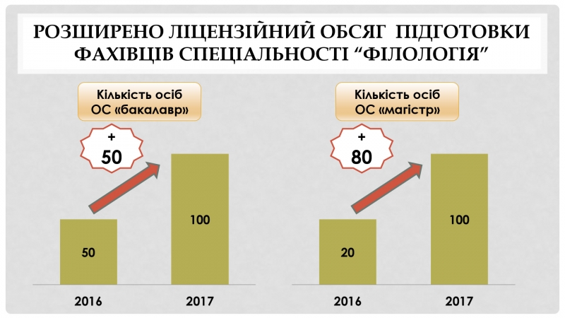 Розширено у 2017 році підготовку фахівців зі спеціальності «Філологія. Англійська і німецька мови (Переклад)» і запроваджено підготовку перекладачів із французької і польської мов та збільшено ліцензійний обсяг бакалаврів і магістрів до 100 осіб для денної і заочної форм навчання.
