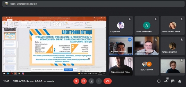 28 березня 2022 р. для студентів 2 потоку 3 курсу агробіологічного факультету НУБіП України старший викладач кафедри ТІДП Карім Ємельяненко в рамках дисципліни "Правова культура особистості" провів відкрите лекційне заняття за темою "Звернення громадян та їх роль у забезпеченні цінності правового регулювання".