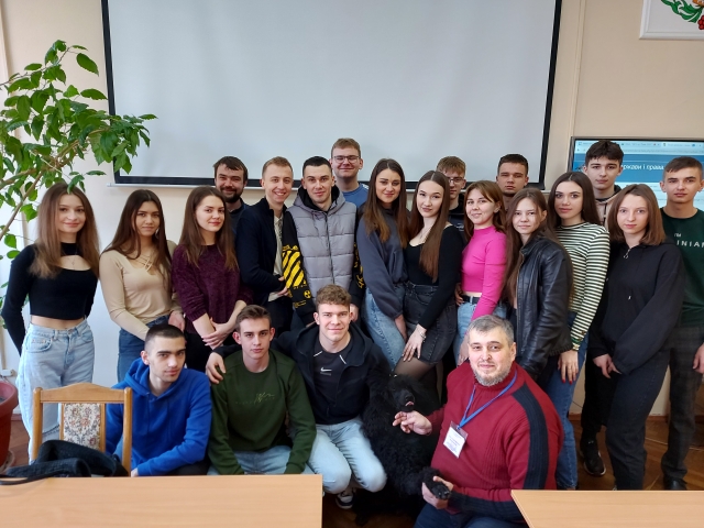 21 березня 2023 року на запрошення кафедри теорії та історії держави і права до студентів 1 курсу юридичного факультету завітали представники волонтерської спільноти «Медико-психологічна допомога» Василь Заболотний, Сергій Шабанов та собака Олівер.