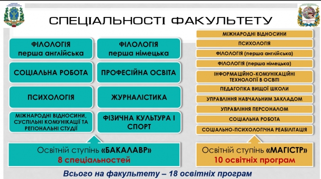 Інна Миколаївна спрезентувала випускникам шкіл, ліцеїв, гімназій, коледжів коротку історію та сучасність факультету, можливості різних спеціальностей, за якими гуманітарно-педагогічний факультет готує фахівців, розповіла про науковий потенціал кафедр, умови вступу та вимоги до навчання, соціальну інфраструктуру, можливість отримати подвійні дипломи і другу вищу освіту протягом навчання на бакалавраті, про міжнародне стажування, програми мобільності і про те, чому зможуть навчитися майбутні студенти та де зможуть працювати після отримання диплома.
