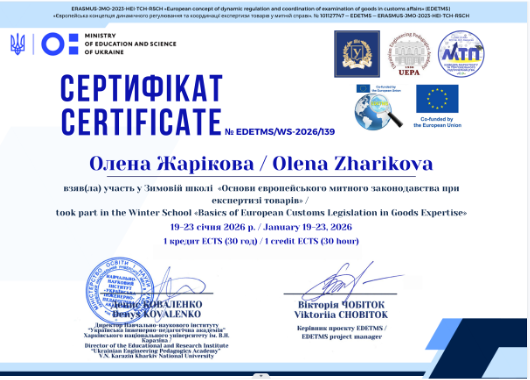 У січні 2026 р. доцент Жарікова Олена прийняла участь у Зимовій школі «Основи європейського митного законодавства при експертизі товарів», яка відбулася з 19 по 23 січня 2026 року. Тематика школи охоплювала питання європейського митного законодавства та практичні аспекти експертизи товарів, що є надзвичайно актуальним у контексті інтеграції України до європейського економічного простору та гармонізації національних митних процедур із нормами ЄС. Формат навчання передбачав інтенсивне занурення у спеціалізовану тематику у вигляді зимової школи, що дало можливість поєднати теоретичні знання із практичними навичками, необхідними для ефективної роботи у сфері митного контролю та аналізу товарів.