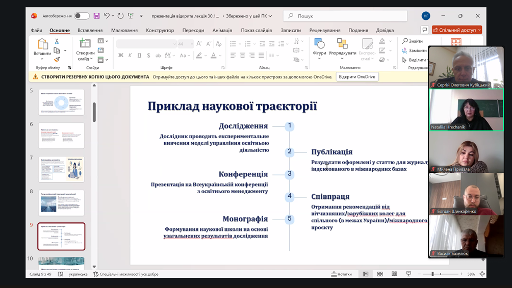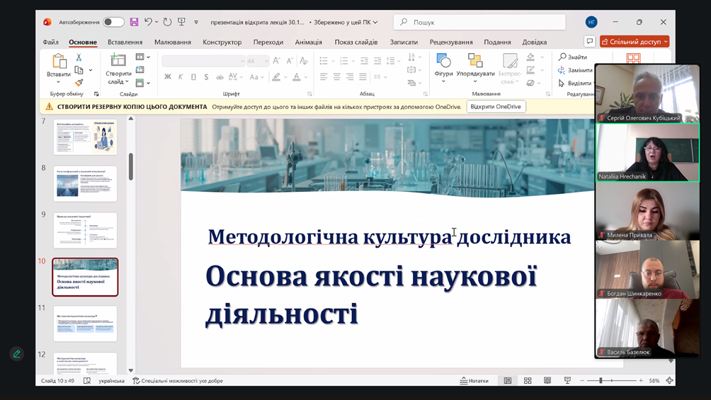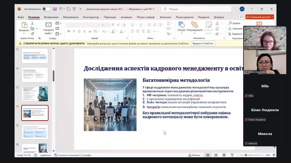 Заняття об’єднало здобувачів кафедри магістерського рівня ОПП «Управління персоналом», ОПП/ОНП «Управління закладом освіти», викладачів кафедри, для яких розвиток наукової культури, методологічної грамотності та управлінського мислення є важливою умовою професійного зростання.