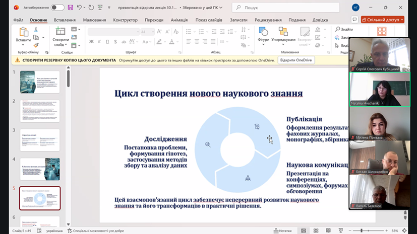 У лекції було послідовно розкрито ключові напрями професійної діяльності сучасного дослідника: наукову, методологічну, управлінську, правову й етичну. Центральним поняттям виступила наукова функція, яка полягає у створенні нового знання, його практичному застосуванні й подальшій трансформації в соціальні інновації. На прикладі досліджень у сфері імерсивних технологій (VR, AR), біотехнологій і педагогічних експериментів продемонстровано, що наука сьогодні не обмежується лабораторією чи аудиторією – вона стає інструментом вирішення реальних проблем освіти, економіки та культури. Важливою складовою цієї діяльності є публікаційна активність – процес наукової верифікації й популяризації результатів у фахових журналах, монографіях, збірниках конференцій, що забезпечує академічне визнання та міжнародну видимість українських досліджень.