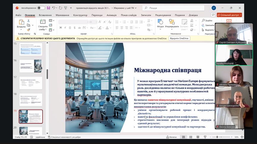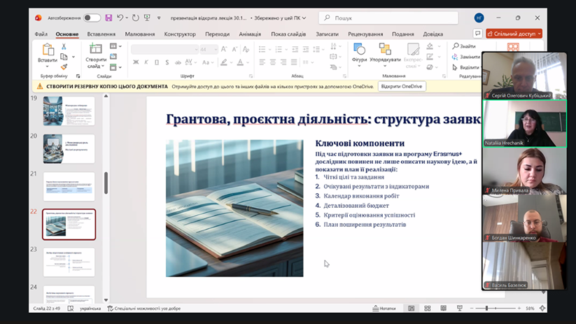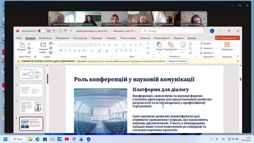 30 жовтня 2025 року на кафедрі управління та освітніх технологій факультету гуманітарно-педагогічних наук НУБіП України відбулася відкрита лекція професора Наталії ГРЕЧАНИК на тему «Роль дослідника в сучасній освіті: між наукою, менеджментом і правом» в межах викладання нормативної дисципліни «Методологія та організація наукових досліджень з основами інтелектуальної власності».