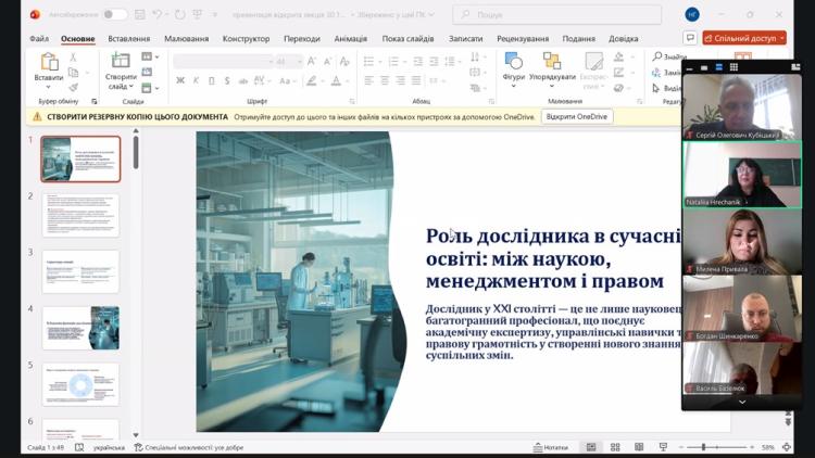 Лектор підкреслила, що сучасний дослідник – це не лише автор наукових статей, а насамперед універсальний фахівець, який поєднує в своїй діяльності аналітичне мислення, управлінські компетентності, етичну свідомість і правову культуру. У XXI столітті науковець має бути здатним мислити системно, координувати міждисциплінарні команди, організовувати наукові проєкти, дотримуватись принципів академічної доброчесності та водночас бути провідником інноваційних змін у суспільстві. Саме така багатовимірність ролі дослідника формує нову модель науковця – не лише генератора знань, а й менеджера наукового процесу, лідера команд, правознавця й комунікатора між наукою, освітою та суспільством.