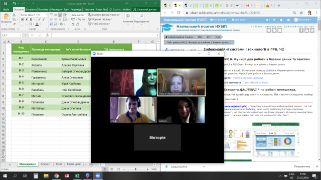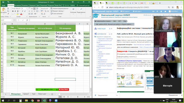 Студенти мали змогу одночасно бачити викладача, колег, завдання на курсі elearn та спостерігати за виконанням прикладу по пошуку даних в інтернет та їх первинного аналізу в MS Excel.