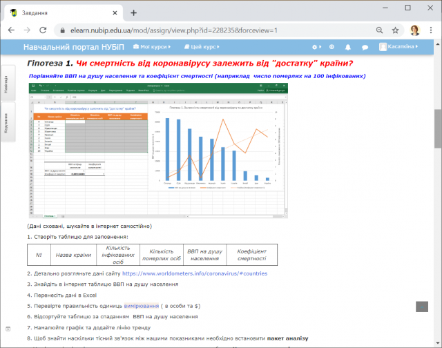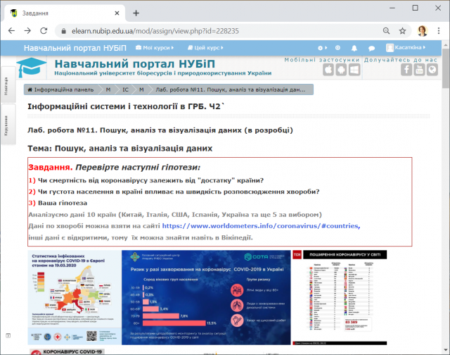 В змісті завдання, що детально описане в курсі elearn, студентам пропонувались гіпотези щодо пандемії коронавірусу, які після аналізу світових статистичних даних, треба було підтвердити чи спростувати.