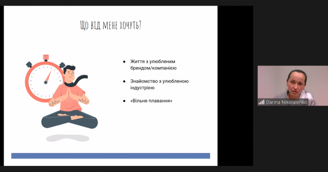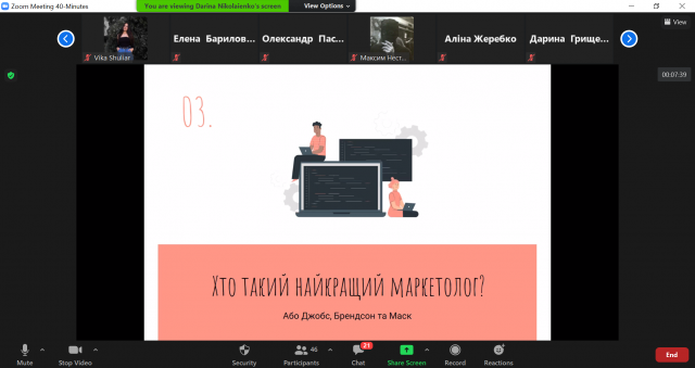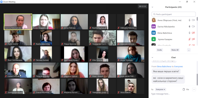 27 квітня 2021 Дарина Юріївна Ніколаєнко - провідний фахівець з маркетингу «Moët Hennessy Ukraine Portfolio» та «Marie Brizard Ukraine Portfolio» компанії «Український дім імпорту», провела лекцію на тему: «Професія маркетолога: як стати найкращим» для студентів 1 курсу ОС Бакалавр спеціальності 075 Маркетинг.