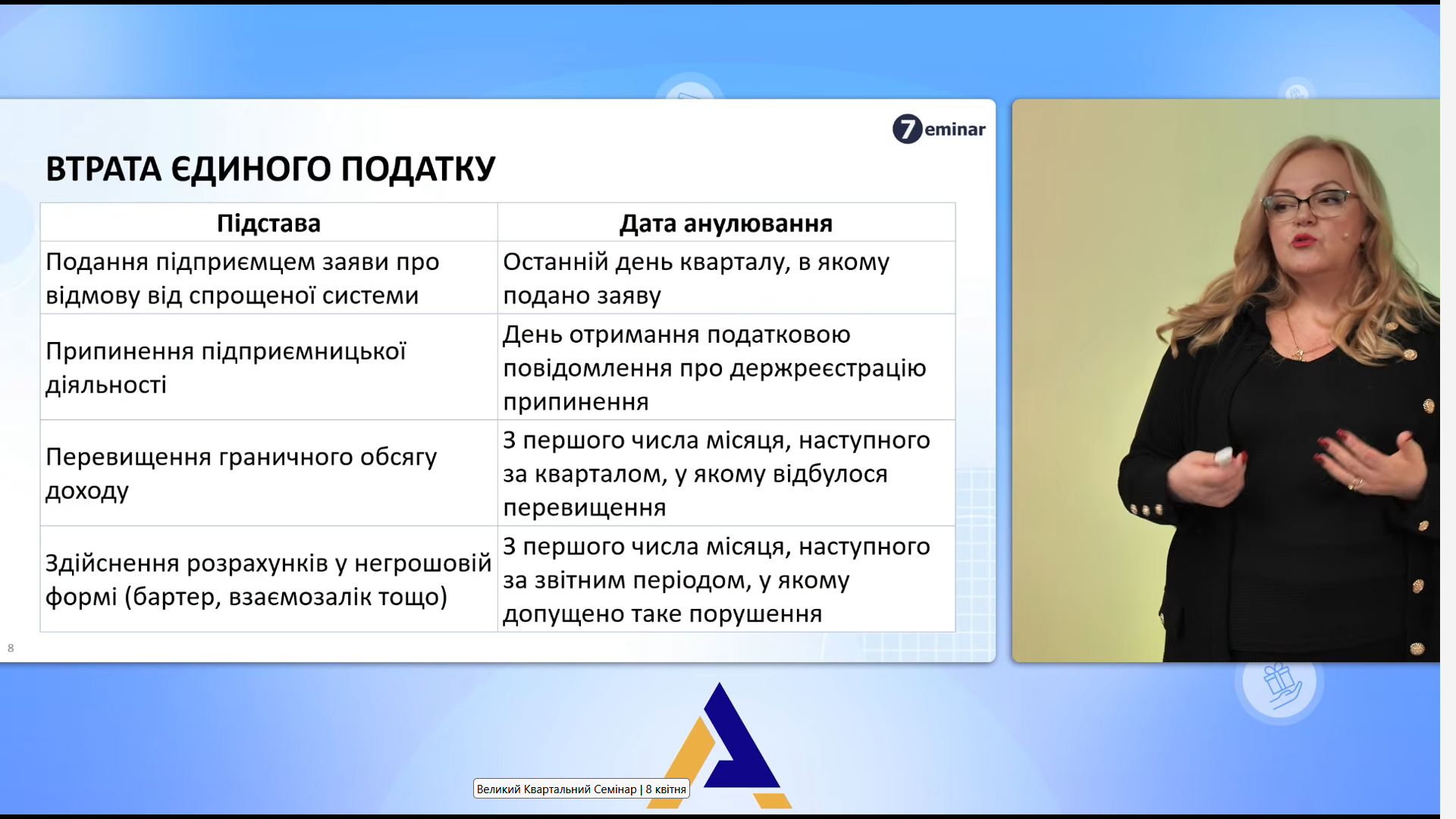 Для учасників семінару відомі експерти - Мар’яна Кавин, Вікторія Величко та Галина Казначей представили цікаві лекції, де просто і по суті висвітлили усі законодавчі зміни, розібрали реальні робочі ситуації з ризиками та надали практичні рекомендації: у яких випадках акт без підпису буде законним, а коли податківці можуть не визнати витрати, коли та за яких умов можуть запровадити ПДВ для ФОП, податки з доходів онлайн-платформ та ПДВ на посилки, як безпечно звітувати ФОПу за І квартал 2026 року, якщо квартальної форми досі немає, які зміни правил оподаткування ФОП можуть призвести до втрати спрощеної системи, як з 1 квітня правильно оформити та розрахувати лікарняні/декретні і уникнути претензій ПФУ, як правильно розрахувати норматив щодо осіб з інвалідністю за 1 квартал, як правильно визначити фінансовий результат і податкові різниці за підсумками кварталу, де межа між податковою оптимізацією та мінімізацією, яка може призвести до блокування податкових накладних, які помилки при експорті та імпорті можуть призвести до втрати податкового кредиту, які помилки виникають при застосуванні особливого режиму оподаткування (податок на виведений капітал)? На ці та багато інших питань можна було отримати відповідь на семінарі.