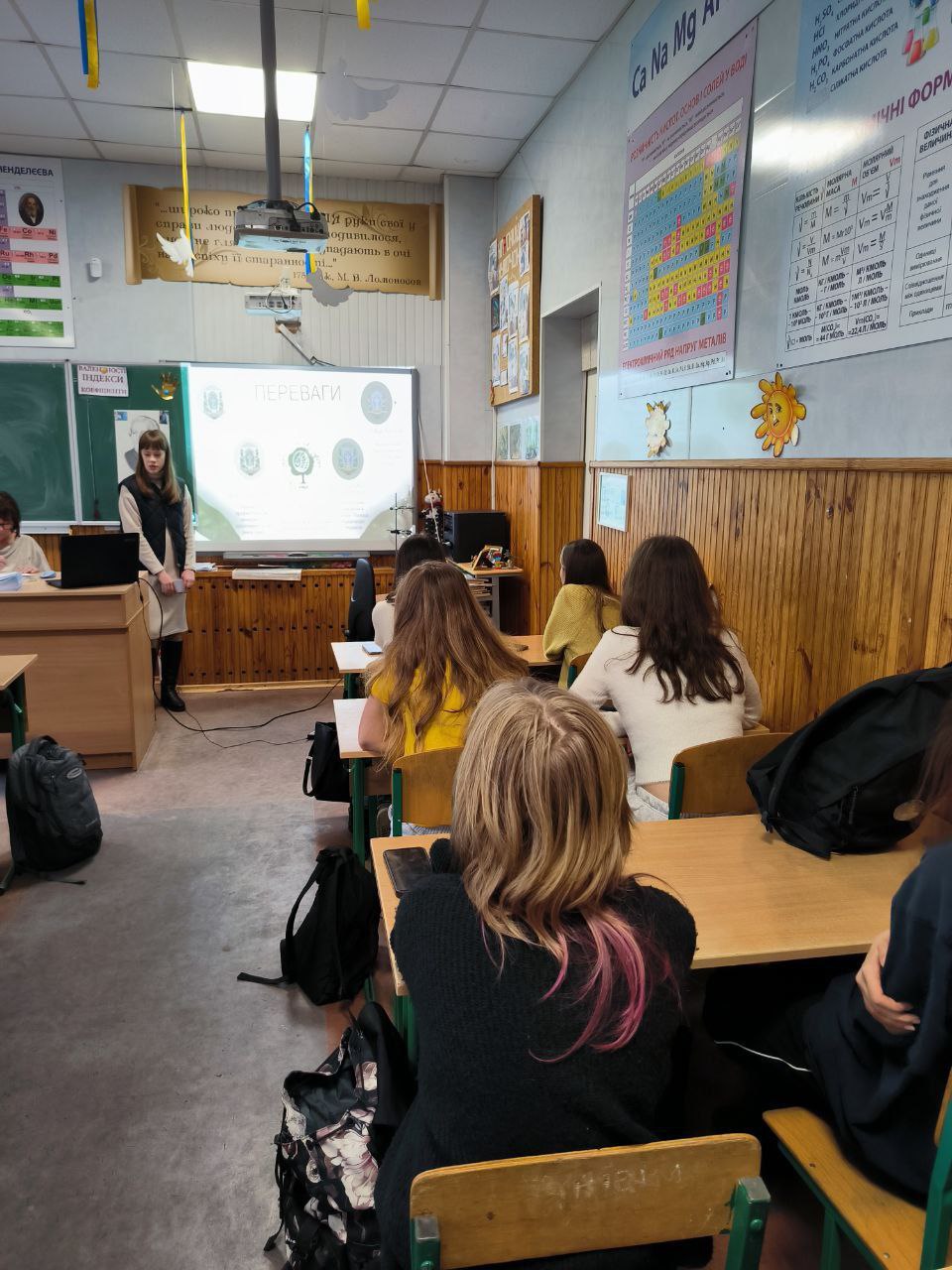 Учні дізналися багато цікавої інформації про Національний університет біоресурсів та природокористування та про факультет захисту рослин, біотехнологій та екології, а саме: про наукові та навчальні лабораторії, спортивні та культурні секції, клуби за інтересами. Яна детально розповіла про сучасні спеціальності, такі як "Екологія", "Біотехнології та біоінженерія", "Захист і карантин рослин", наголосила на існуючих програмах міжнародної мобільності та стажування закордоном, розповіла про роботу за фахом.