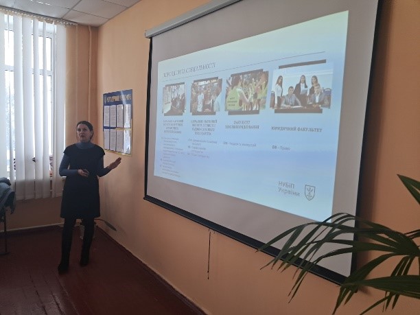 Під час презентації Ольга Гогуля ознайомила здобувачів вищої освіти з перевагами та особливостями освітньої, культурно-виховної, науково-дослідної, інноваційної та навчально-виробничої діяльності університету. Акцентувала увагу на більш ніж 125-річній історії закладу, його потужній структурі, що включає 3 інститути, 13 факультетів, 365 сучасних лабораторій, а також широкий спектр підрозділів і спеціальностей, які забезпечують якісну підготовку фахівців за актуальними напрямами. Окремо представила позиції Університету в національних та міжнародних рейтингах, зокрема серед закладів вищої освіти м. Києва, України та у QS рейтингу університетів світу, що підтверджує високий рівень розвитку, конкурентоспроможність і міжнародне визнання. Звернула увагу студентів-випускників коледжу про особливості підготовки до складання НМТ. Під час зустрічі Ольга Гогуля наголосила на зручній і комфортній студентській інфраструктурі та можливостях всебічного розвитку: власний Ботанічний сад як простір для навчання, наукових досліджень і відпочинку; затишне та комфортне житло для студентів; діяльність творчих колективів; потужний спортивний напрям, що забезпечив Університету ТОП-1 з розвитку спорту в м. Києві протягом двох років поспіль та ТОП-3 в Україні.