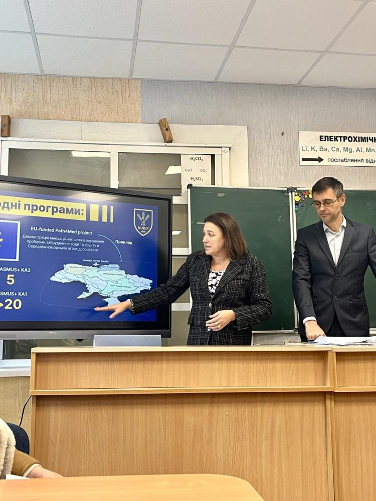 Віта СТРОКАЛЬ презентувала доповідь, де ознайомила молодих людей із рейтингом університету в міжнародних та національних рейтингах, напрямками наукової роботи факультетів та активним життям студентства. Коротко зупинилася на можливостях університету, відмітивши ту велику кількість заходів, у яких безпосередніми учасниками можуть бути студенти впродовж років навчання, а це і відвідування спортивних секцій, наукових гуртків, театральних і мистецьких студії, участь у хорі чи народному ансамблі, тощо. Потім Віта Строкаль наголосила на актуальності вступу на спеціальності, предметами вивчення яких інтернаціональні та мультидисциплінарні підходи в університеті, що направленні на розробку новітніх технологій, які пов’язані із охороною, збереженням природних ресурсів та біорізноманіття, впровадженням природоорієнтованих рішень. Віта СТРОКАЛЬ показала власний приклад проведення наукових досліджень у рамках виконання міжнародного проекту EU Horizon Europe project Path4Med "Demostrating innovative pathways addressing water and soil pollution in the Mediterranean Agro-Hydro-System" та ознайомила із науковими напрямками досліджень співробітників кафедри. Євгеній БЕРЕЖНЯК зосередив увагу на важливості запису на підготовчі курси, зазначивши, що їх відвідування та успішне завершення дає можливість отримання додаткових балів, які у кінцевому результаті можуть сильно допомогти при вступі на бажану спеціальність. Такі перспективи зацікавили декого із учнів.