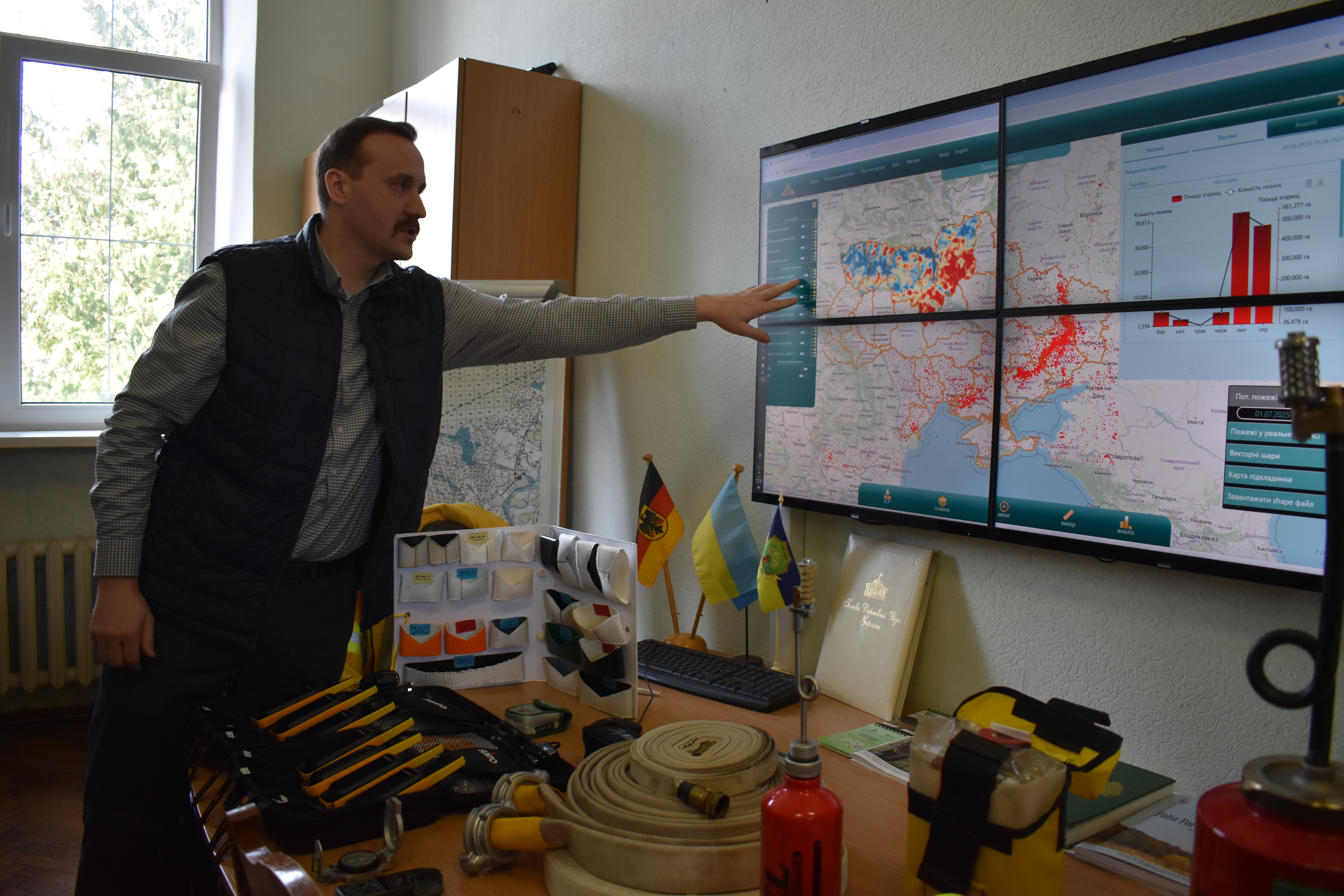 Навчальна лабораторія дистанційного моніторингу лісів: старший викладач кафедри таксації лісу та лісового менеджменту Євгеній ХАНЬ ознайомив школярів з високотехнологічним простором. Ця сучасна лабораторія, створена у співпраці з чеськими партнерами (CzechAid), обладнана потужними графічними станціями та двомоніторними робочими місцями, що дає змогу здійснити повний цикл роботи з просторовими даними – від дешифрування супутникових знімків до друку цифрових карт на широкоформатному плотері.