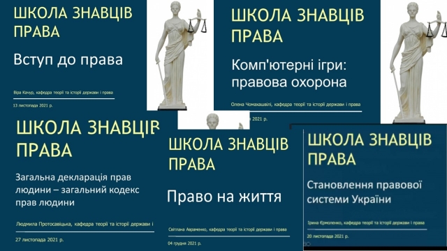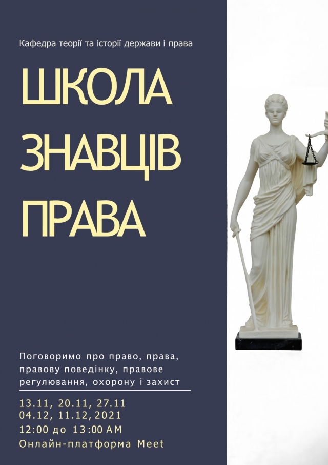 Цього тижня кафедра теорії та історії держави і права завершила першу серію онлайн-вебінарів, проведених у рамках просвітницького проєкту «Школа знавців права». Протягом п’яти тижнів учасники та учасниці, які виявили бажання доєднатися до його роботи, кожної суботи, починаючи з 13 листопада 2021 року доєднувалися за покликаннями до онлайн-зустрічей.