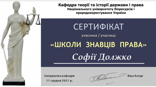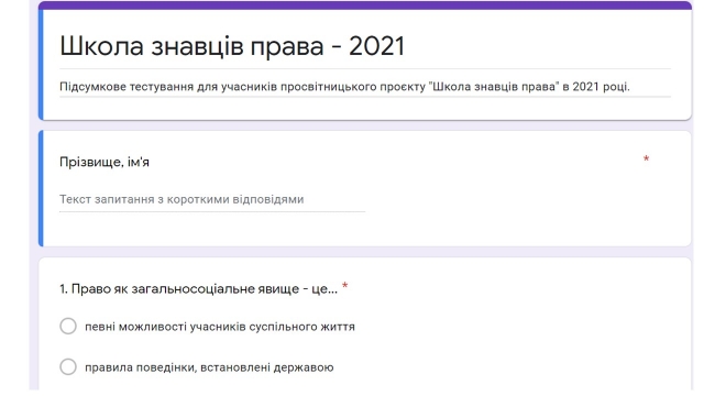 Усі учасники «Школи знавців права», а їх зареєструвалося близько 90 осіб, мали змогу отримати електронний сертифікат про участь лише пройшовши до 18 грудня 2021 р. включно підсумкове тестування, яка нараховувало 15 запитань з усіх заявлених тем.