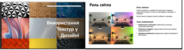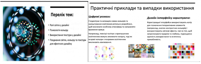 Лектор також зупинився на програмному інструментарії, а саме - Adobe Photoshop, який широко використовується для створення та редагування зображень, дозволяючи дизайнерам маніпулювати кольорами та ефектами освітлення, а також використанні Sketch - векторного інструменту, що популярний для дизайну UI/UX, що пропонує функції для експериментів із кольоровими палітрами та макетами інтерфейсу. Надалі закцентував на ролі світла: ​світло впливає на сприйняття простору та форми, акцентуючи увага на тому, як виглядають текстури та кольори, світло може створити ілюзію глибини та розміру. ​Розповів також про типи освітлення: ​навколишнє освітлення: забезпечує загальне освітлення простору; ​освітлення завдань: сфокусоване світло для певних видів діяльності та акцентому освітленні, яке підкреслює окремі особливості або області.​
