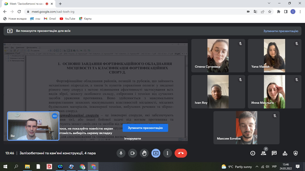 24 березня 2022 року студентами 4 курсу БЦІ-1804, БЦІ-2005ск було прослухано лекцію проф. Яковенка І.А. з дисципліни «Залізобетонні та кам’яні конструкції» на тему: «Основні завдання фортифікаційного обладнання місцевості та класифікація фортифікаційних споруд». Розглянуті питання про порядок фортифікаційного обладнання позицій та районів, їхня класифікація та послідовність зведення зацікавили майбутніх інженерів-будівельників у непростий для нашої країни час.