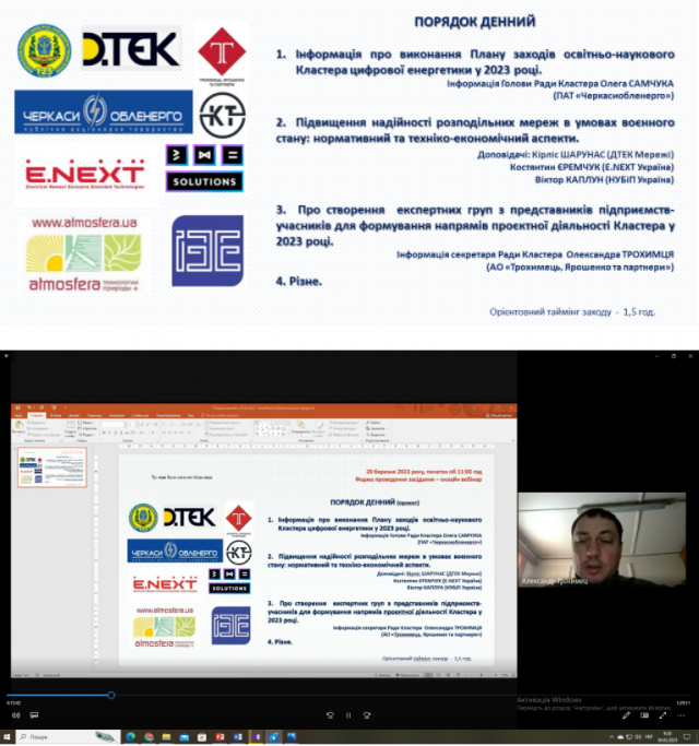 В кінці минулого року, на установчому засіданні, учасники схвалили План заходів освітньо-наукового Кластера цифрової енергетики на 2023 рік, у відповідності до якого голова Ради Кластера Олег Самчук, секретар Ради Кластера Олександр Трохимець та директор ННІ енергетики, автоматики і енергозбереження НУБіП України Віктор Каплун підготували пропозиції до порядку денного засідання Ради Кластера та інформаційну довідку про діяльність І кварталі поточного року.