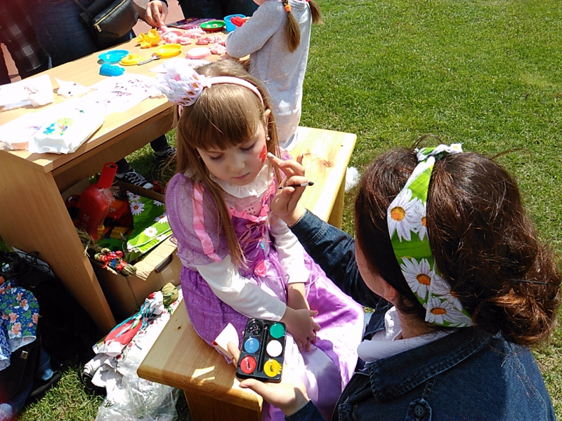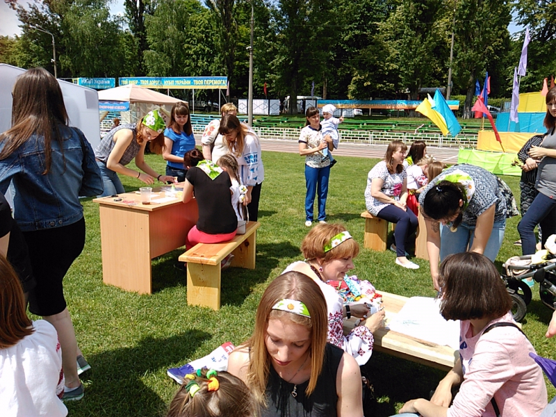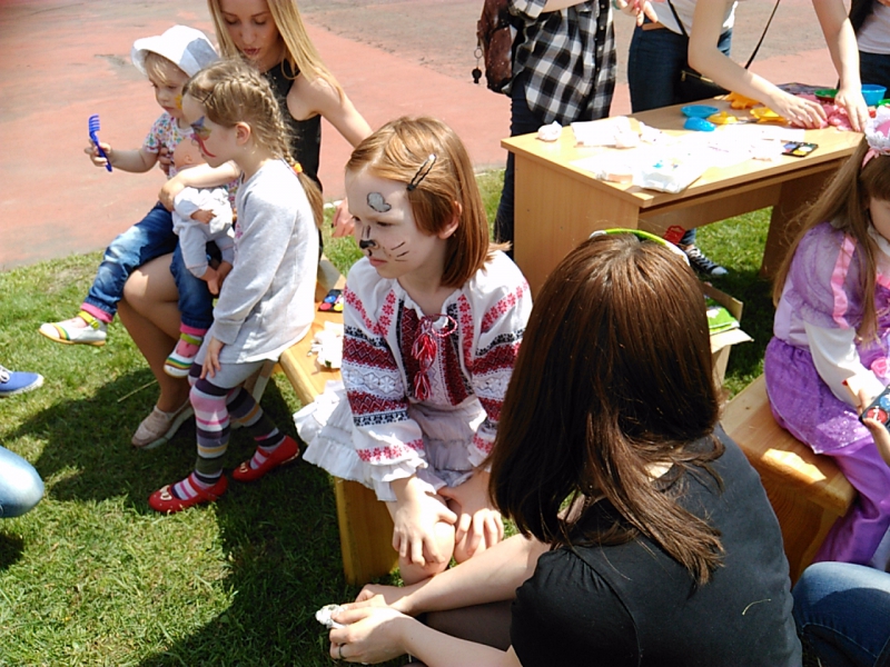 виготовляти вироби з піску, брати участь у дійстві створення ляльки-мотанки, мудрувати над створенням браслетів, сережок з тільки їм властивою гамою кольорів тощо. Кожна дитина та її мамуся могли скористатися аквагримом. Ці неймовірно гарнюсінькі дитячі личка ходили на нашому стадіоні, вболіваючи за мам, татків і дідусів, що змагалися між собою.