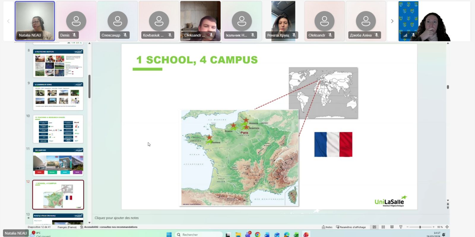 Під час презентації пані Natalie Neau надала детальну інформацію щодо академічної структури Institut Polytechnique UniLaSalle, освітніх стандартів у Франції та вимог до інженерних програм. Зокрема, було охарактеризовано: