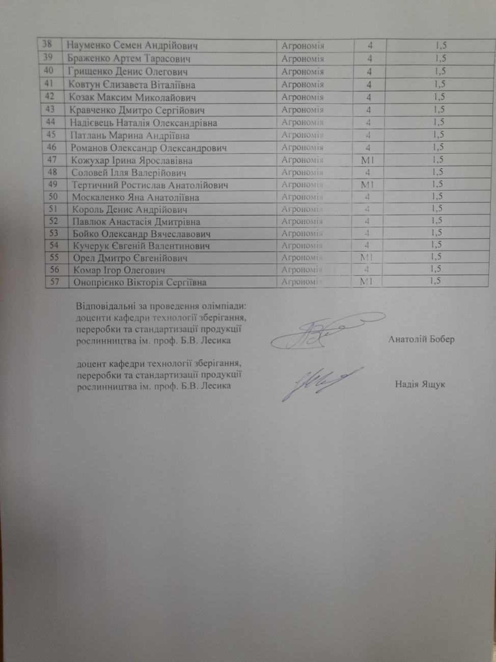 Результати I етапу студентської олімпіади з дисципліни «Технологія зберігання і переробки продукції рослинництва»