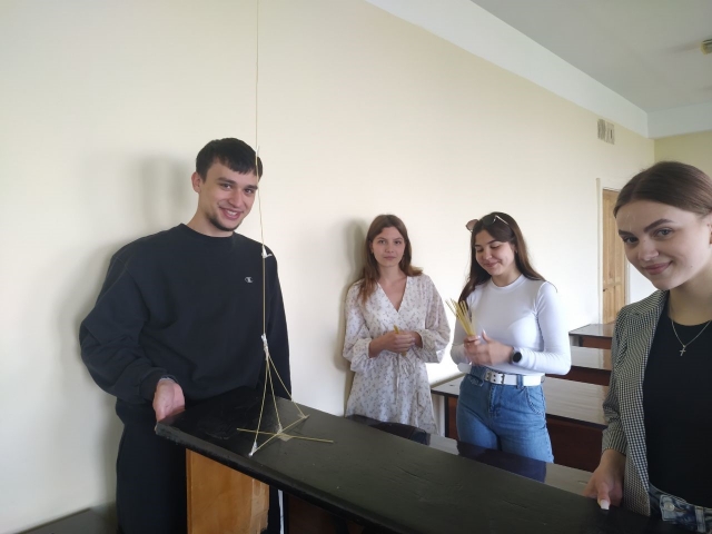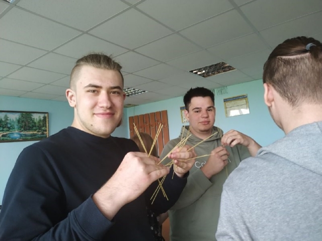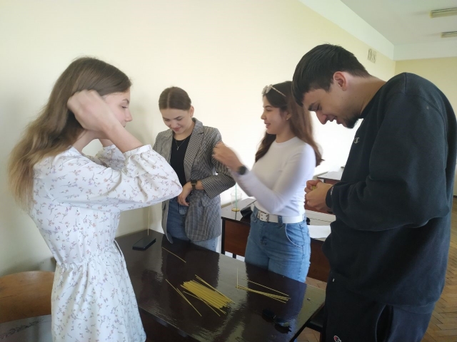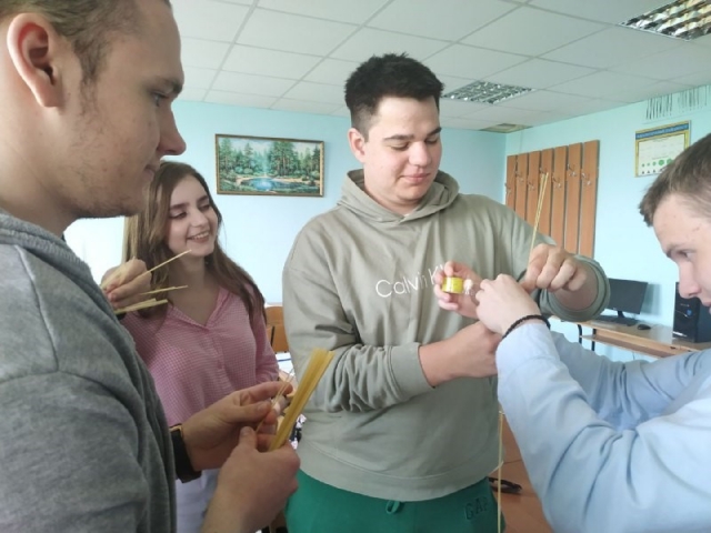 Для роботи знадобилися: спагеті, клейка стрічка, мотузка, маршмелоу, ножиці. За 25 хв. студентам потрібно було побудувати башту з наявних матеріалів.