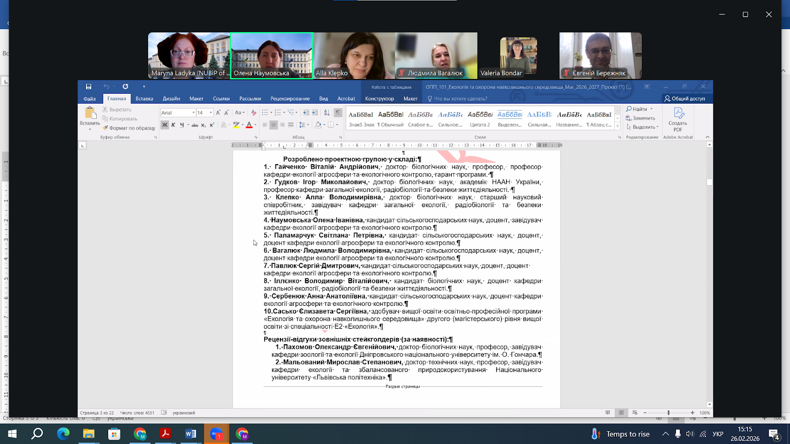 26 лютого 2026 року в дистанційному форматі відбулося розширене засідання за участі гарантів освітніх програм та членів проектних груп. До складу учасників увійшли провідні науково-педагогічні працівники кафедр екології агросфери та екологічного контролю та кафедри загальної екології, радіобіології та безпеки життєдіяльності. На порядку денному було розглянуто освітньо-професійні програми першого (бакалаврського) та другого (магістерського) рівнів за спеціальністю Е2 «Екологія» та першого (бакалаврського) рівня за спеціальністю G2 «Технології захисту навколишнього середовища».
