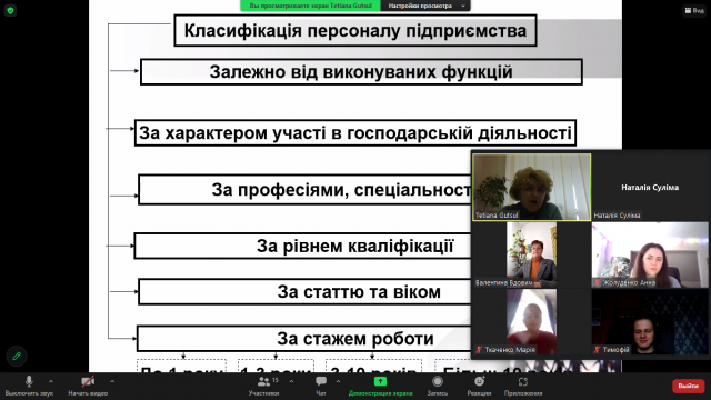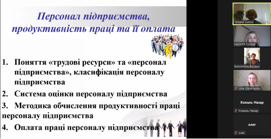 Проведення в відокремлених структурних підрозділах університету відкритих гостьових лекцій на засадах співпраці стало доброю традицією на економічному факультеті. Ця сучасна та ефективна форма занять передбачає розвиток критичного мислення здобувачів освіти, комунікації в процесі навчання, набуття членами педагогічного колективу нового досвіду використання інноваційних методів. В рамках такої співпраці, на запрошення циклової комісії маркетингу, торгівлі та харчових технологій ВСП "Ірпінський фаховий коледж НУБіП України" гостьову лекцію для студентів 2 курсу спеціальності 181 «Харчові технології» провела к.е.н., доцент кафедри економіки НУБіП України, гарант магістерської освітньої програми «Економіка підприємства» Тетяна Гуцул. Тема лекції «Персонал підприємства, продуктивність праці та її оплата» є складовою вивчення дисципліни «Економіка підприємств різних типів» в рамках теми «Трудові ресурси підприємства». Саме тому модераторкою лекції, що була проведена з використанням сервісу Zoom, виступила викладачка дисципліни к.е.н. Валентина Вдович. У вступному слові вона звернула увагу студентів на те, що тема трудозабезпечення підприємства є актуальною для всіх галузей економіки, зокрема і сфери громадського харчування, оскільки достатня забезпеченість потрібними трудовими ресурсами, раціональне використання їх, високий рівень продуктивності праці мають велике значення для підвищення ефективності функціонування підприємств.