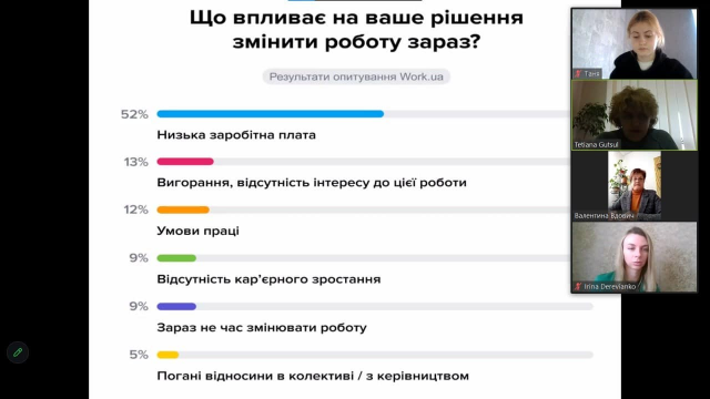 В ході лекції було доступно розкрито економічну сутність категорій «трудові ресурси», «робоча сила», «людський капітал», «персонал підприємства», основні рівні їх класифікації, особливості використання персоналу та формування трудового потенціалу підприємства. Лектор детально охарактеризувала методики оцінки використання персоналу підприємства, обчислення продуктивності праці як показника результативності та ефективності трудової діяльності.