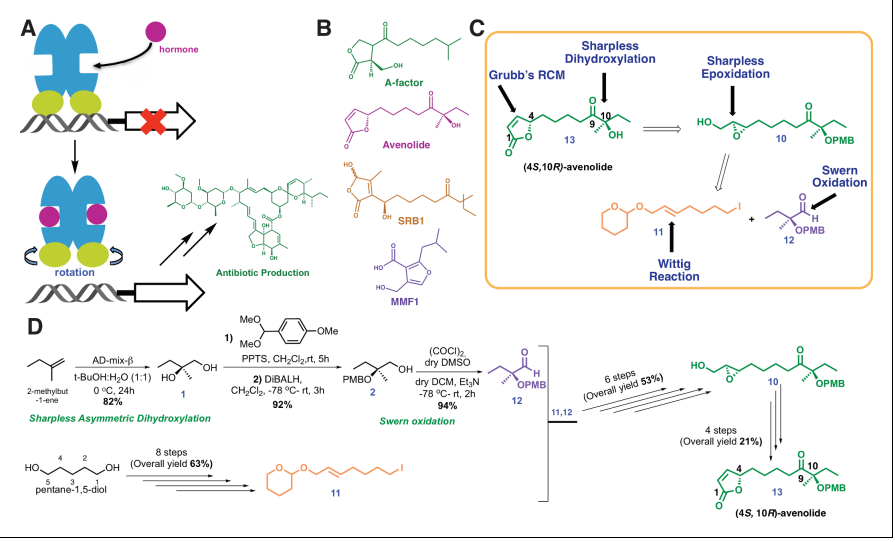 Рисунок 2. - Хімічні структури та ретросинтетична схема авеноліду. (A) Зображення механізму гормон-індукованої транскрипційної активації у бактерій. (B) Структури репрезентативних сполук з чотирьох відомих класів бактеріальних гормонів. A-фактор – це g-бутиролактон, авенолід – це алкілбутенолід, SRB1 – це 2-алкіл-3-метил-4-гідроксибутенолід, а MMF1 – це 2-алкіл-4-гідроксиметилфуран-3-карбонова кислота. (C) Ретросинтетична схема синтезу авеноліду, що включає п'ять ключових реакцій. (D) Загальна узагальнена та синтетична схема повного синтезу (4S,10R)-авеноліду із загальною кількістю етапів та виходами реакцій.