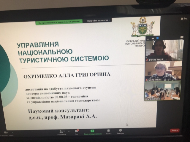Завідувач кафедри туристичного та готельно - ресторанного бізнесу і консалтингу ННІ НОіТ, д.е.н., доцент Дарія Басюк виступила офіційним опонентом дисертаційної роботи Охріменко Алли Григорівни на тему «Управління національною туристичною системою», подану на здобуття наукового ступеня доктора економічних наук за спеціальністю 08.00.03 – економіка та управління національним господарством. Захист дисертації відбувся у спеціалізованій вченій раді при Київському національному торговельно-економічному університеті під головуванням ректора, проф. Анатолія Мазаракі.