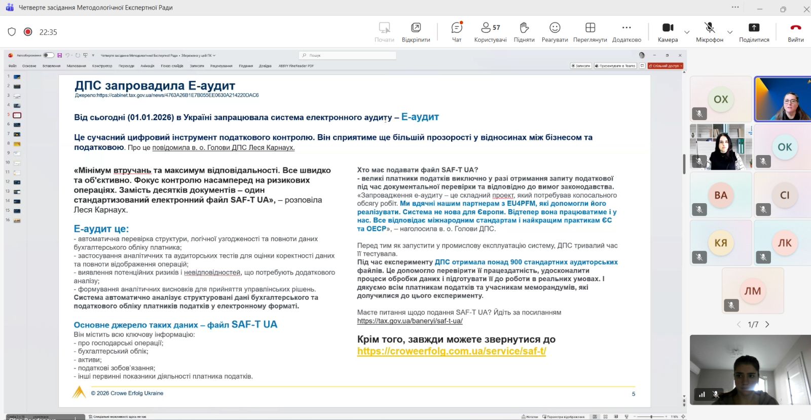 У межах проведення 4-го засідання Методологічної експертної ради на тему «Презентація від SAF-T до Е-аудиту. МСФЗ в Україні як практичний виклик:коло зобов’язаних, межі автоматизації та роль XBRL у новій якості фінансової звітності» участь у заході взяли науково-педагогічні працівники кафедри обліку та оподаткування та здобувачі вищої освіти: завідувач кафедри Володимир ЛИТВИНЕНКО, гарант освітньої програми «Облік і аудит» першого (бакалаврського) рівня вищої освіти, керівник гуртка «Студія професійного бухгалтера» Наталія КУЗИК, а також інші науково-педагогічні працівники кафедри.