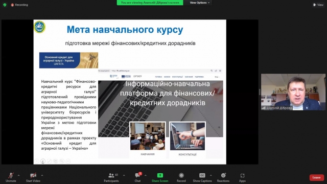 Відбувся семінар «Підготовка фінансових/кредитних дорадників: роль закладів аграрної освіти і науки», який було організовано проєктом «Технічна Допомога на підтримку впровадження операції «Основний кредит для аграрної галузі – Україна» UAFATA, Науково-методичним центром вищої та фахової передвищої освіти Міністерства освіти і науки України та Національною асоціацією сільськогосподарських дорадчих служб України (НАСДСУ) для інформування щодо впровадження інформаційно-навчальної платформи для фінансових/кредитних дорадників та навчального курсу "Фінансово-кредитні ресурси для аграрної галузі", створених фахівцями Національного університету біоресурсів і природокористування України за підтримки проєкту UAFATA.