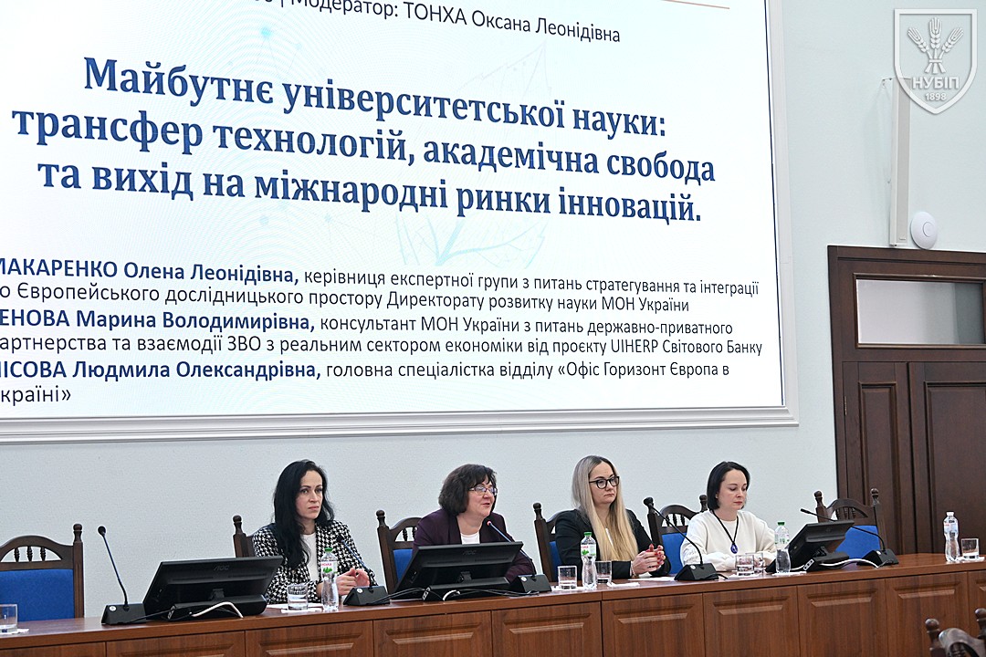 Другий блок «Науково-інноваційна діяльність та міжнародна панель» модерувала проректор з наукової роботи та інноваційної діяльності Оксана ТОНХА. Вона означила лейтмотиви дискусії про майбутнє університетської науки: трансфер технологій, академічна свобода та вихід на міжнародні ринки інновацій. Спікерами стали керівниця експертної групи з питань стратегування та інтеграції до Європейського дослідницького простору Директорату розвитку науки Міністерства освіти і науки України Олена МАКАРЕНКО, консультант Міністерства освіти і науки України з питань державно-приватного партнерства та взаємодії закладів вищої освіти з реальним сектором економіки Марина ЗЕНОВА та головний спеціаліст відділу «Офісу Горизонт Європа в Україні» Національного фонду досліджень України Людмила ЛІСОВА. Вони в своїх виступах означили перспективи та ключові точки на шляху університетської освіти науки України до європейського дослідницького простору, нову систему пріоритетів науки та інновацій, проекти законопроектів для підтримки розвитку інновацій, базове фінансування дослідницької діяльності в закладах вищої освіти та створення центрів досконалості, новий механізм державного замовлення на науково-технічні розробки та можливості програми HORIZON EUROPE.
